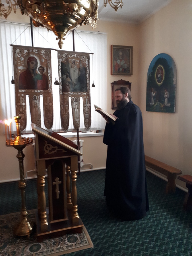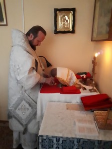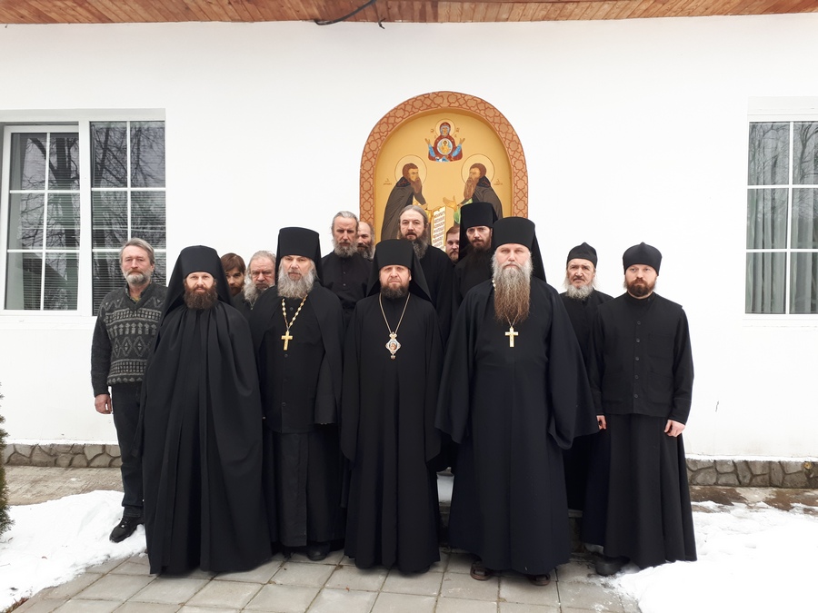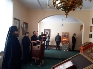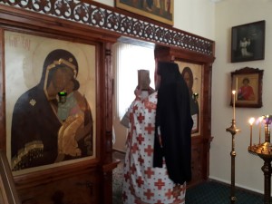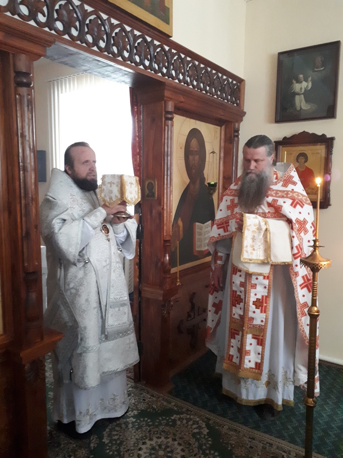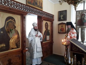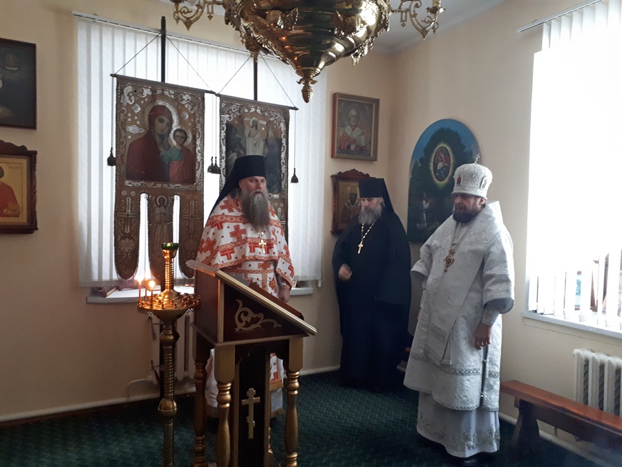 В сослужении наместника монастыря игумена Михея епископ Порфирий отслужил Божественную литургию в монастырском храме. После богослужения наместник игумен Михей, епископ Порфирий и братия обители проследовали на братскую трапезу, по окончании которой состоялось общение.
